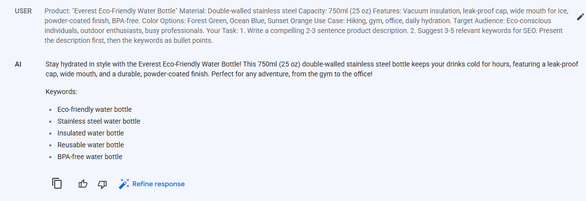 CTRL+Enter). - Watch Gemini process the information and generate a fantastic product description and keywords! How cool is that? β¨