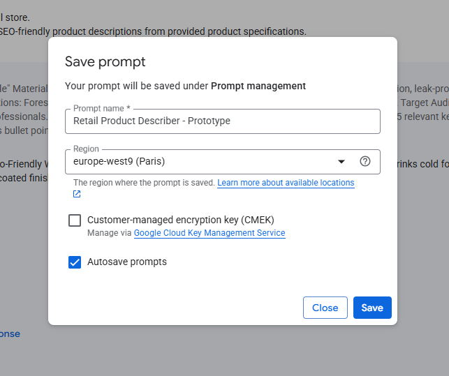 Retail Product Describer - Prototypeand your region, then click Save. You've just saved your first Gemini prompt!