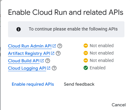- You might be prompted to Enable services (like Cloud Build API, Cloud Run API). Go ahead and click Enable.